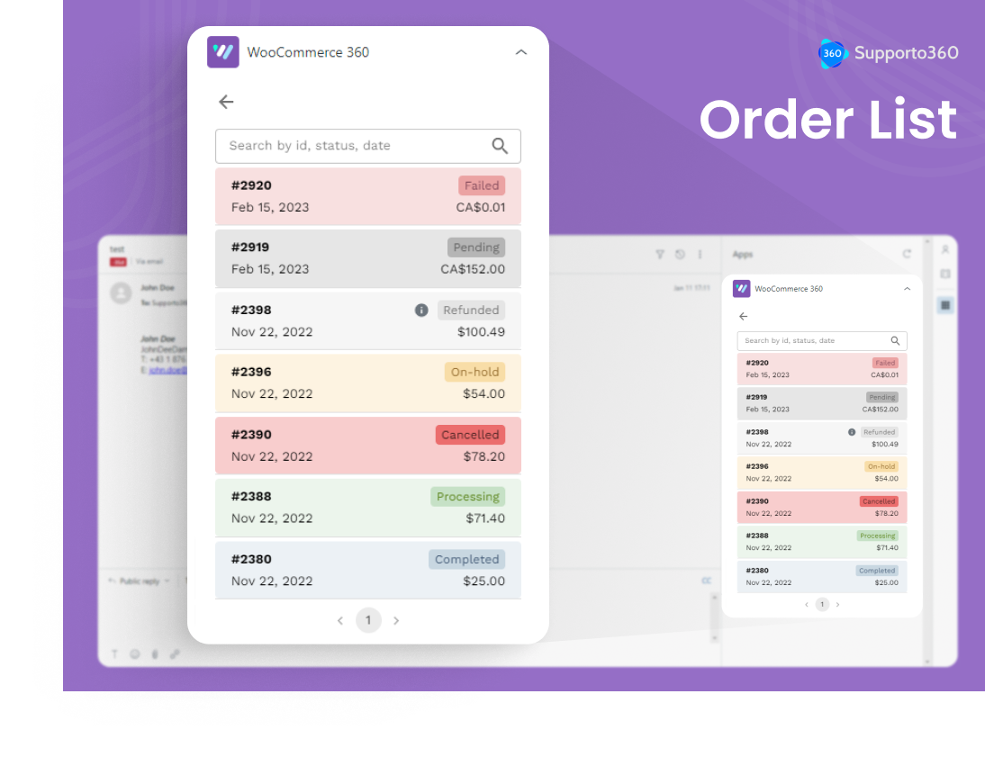 - Show list of orders and detail information such as order number, status, items purchased, coupons, notes and refunds.