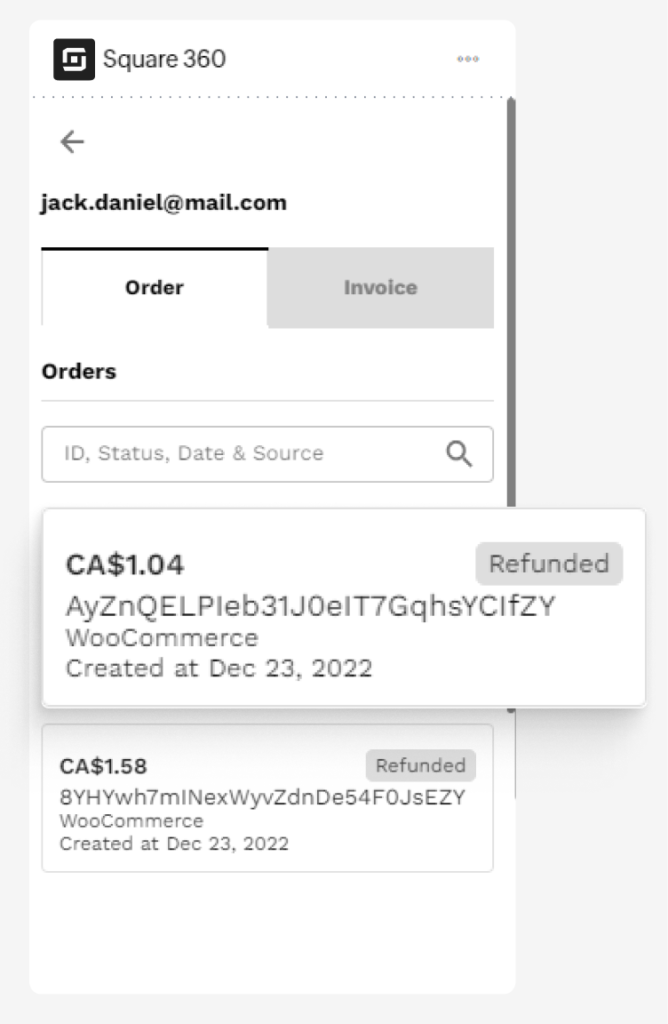 This tab displays orders placed via Square Online or transactions received via other sources (e.g. WooCommerce, OpenTable, GravityForms, Acuity Scheduling, Wix, etc.). All orders and transactions under the ticket requester’s email address are displayed in list format with the following details: