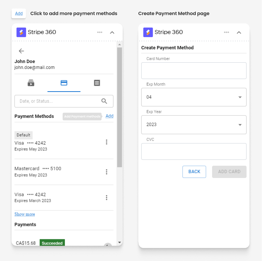 This tab gives agents a complete overview of all payment methods on file, including the ability to edit credit card details and change the default payment method. Payments made so far are also displayed in this tab. with the following details: