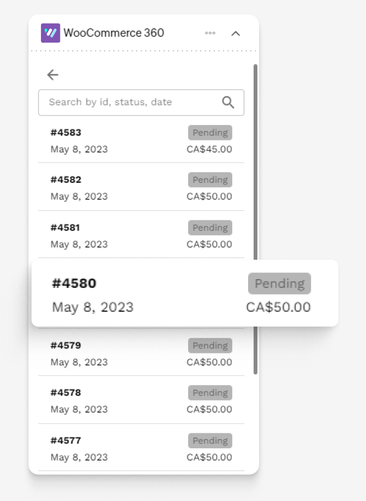 By default, this extension will list the latest 100 orders placed by the ticket requester. Orders will be displayed sorted by the order date (Newest to oldest). Information available in the order list: