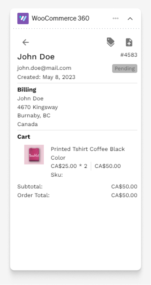 The WooCommerce 360 extension for Zoho Desk allows you to easily access and manage customer information and order details all in the Zoho Desk ticket interface. Here are the main areas of the extension: