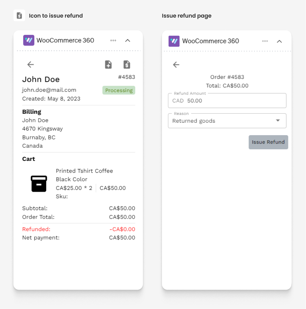 This layout gives agents a complete overview of selected order, including the customer address, items purchased, order totals. Buttons to issue refunds, apply coupons, and add order notes are displayed in the top right corner of the order details page.