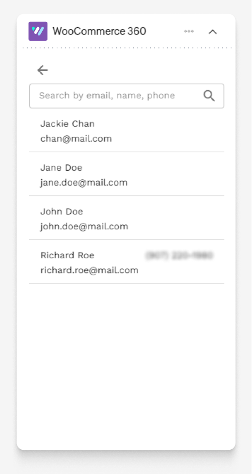 This extension will find matching WooCommerce orders based on the ticket requester’s email address. If the ticket requester’s email is not found in WooCommerce, users will be able to see the list of all customers by clicking the “Customer List” button.